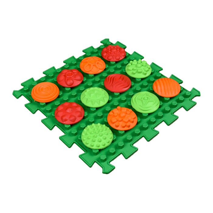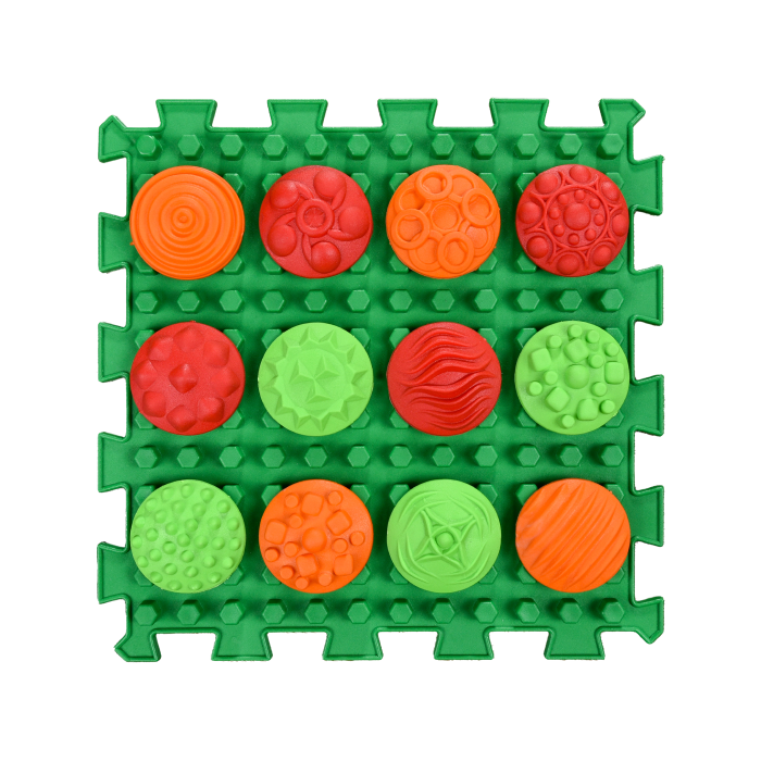 12 видів візерунків мають різну поверхню, що добре розвиває тактильні відчуття та створює різний масажний ефект. Деталі кріпляться на виступаючі “стовпчики” пазла. Дитина може викладати на пазл різнокольорові візерунки або сортувати їх за кольором, викладати їх в довільному порядку, або спробувати викласти фігуру, як з мозаїки. Деталі добре тримаються, тому по ним можна вільно ходити, масажуючи стопи.