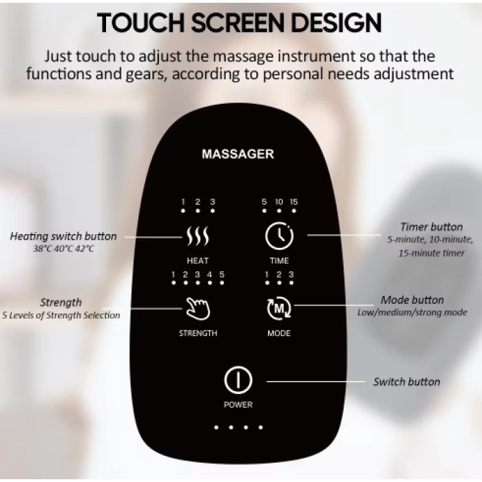 Масажер оснащений функцією нагрівання з трьома рівнями температури (38°C, 40°C та 42°C), що допомагає розігріти м'язи та зняти м'язові спазми. Управління здійснюється через сенсорну панель з LED дисплеєм, де можна вибрати один із трьох режимів масажу та встановити відповідний температурний режим.