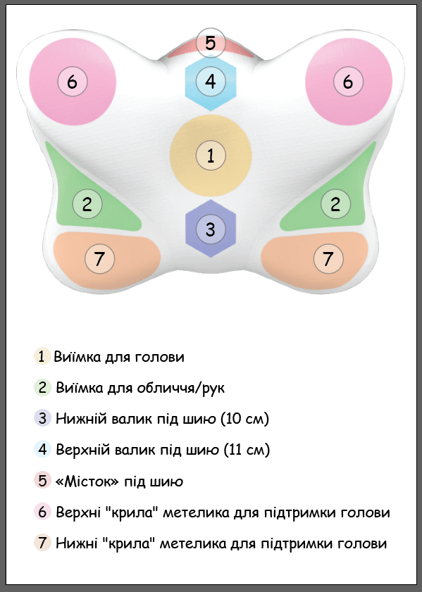 Тим, хто любить спати на спині, ймовірно, підійде більш низька сторона подушки. Але є ті, хто при виборі такого положення, любить високі подушки (так, таке буває - ми теж здивувалися). З обох сторін є спеціальні валики (3 і 4), які підтримують шийний відділ хребта, а додатковий «місток»(5), робить цей перехід максимально плавним. В результаті - шия не буде неприродно згинатися. Крила метелика (6, 7) утримують голову від завалювання на бік, що дуже важливо під час сну на спині.