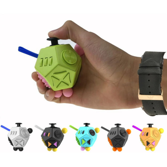 Сенсорний кубик Фіджет має 12 унікальних граней із різними елементами, поверхнями та текстурами.