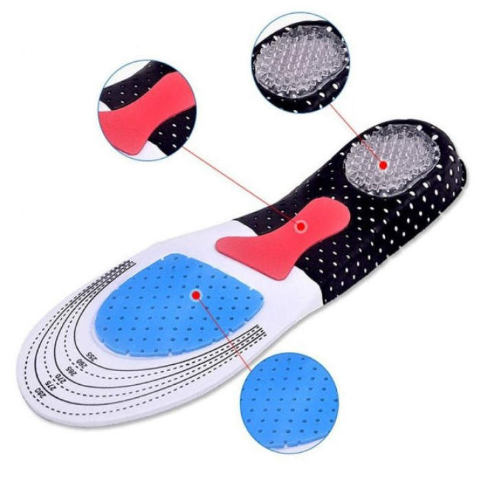 - Амортизуюча вставка з силіконового гелю під п'ятою призначена для зменшення ударного навантаження на п'яту, суглоби ніг та хребет під час ходьби та занять спортом.